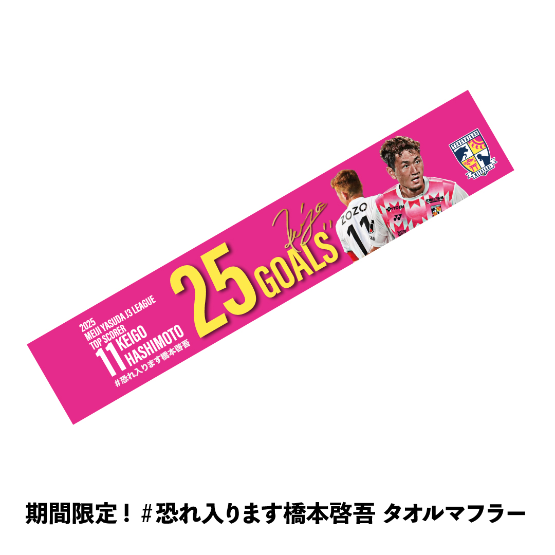 タオルマフラーには明治安田J3リーグ第31節松本山雅FC戦で、実況を担当された平山未夢アナウンサーが放った「恐れ入ります橋本啓吾」という、今季を象徴する名実況をデザインに加えました!この期間しか手に入らない、ハッシーグッズです!